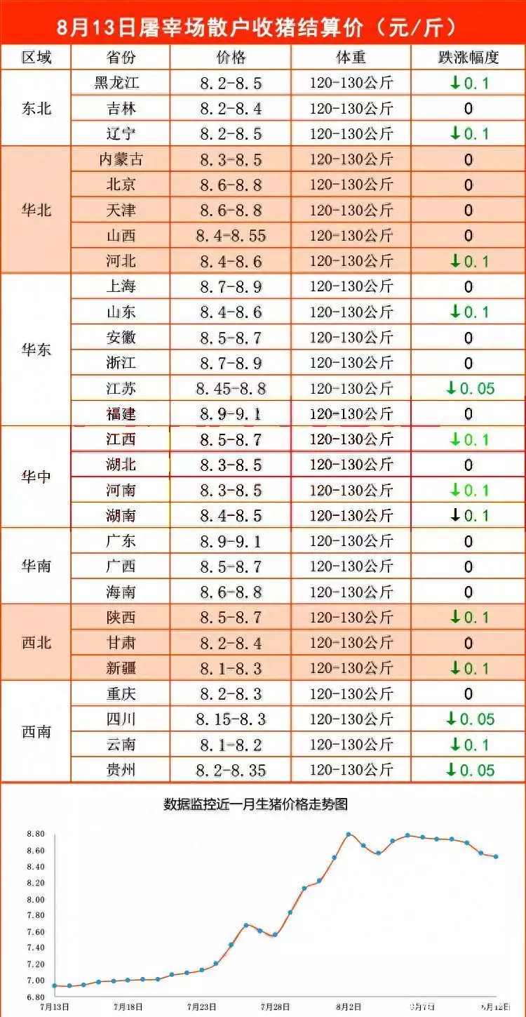 因此,本轮油价上涨风险依然较高,8月13日,山东市场,普通92号汽油价格在8.04元/升左右,此番涨价后,92号汽油或将涨至8.2元/升左右,而95号汽油价格也将逐步涨至8.7~8.8元/升!猪价连降6天,市场挺价转强!