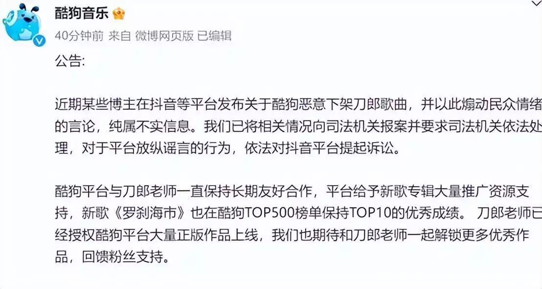 酷狗音乐第一时间公开回应众所周知,在这个“流量为王”的时代,用户就是上帝一旦用户流失过多,那么这个平台也就做不下去了所以,在收到消息的第一时间,酷狗音乐就进行了公开回应酷狗音乐的公告上,用严厉的语气进行辟谣,表示平台与相关歌手长期保持友好合作关系,对刀郎的新专辑也进行了大力推广。