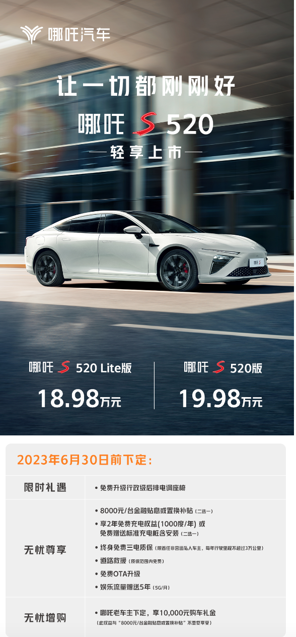 合适的续航、合适的价格、合适的配置,这就是哪吒S的轻享主义,哪吒S 520Lite版和520版刚刚好新车型的加入,让哪吒S版型扩容至十款,达成了“十全十美”的车型阵容,并将售价区间拓宽为18.98万元-34.18万元,不仅满足了“轻享主义”人群的购车选择,降低了业内高品质纯电轿跑的购车门槛,而且填补了哪吒S在20万元以下市场、500km续航的产品空白,让更多用户可以轻松享受触手可及的高品质出行生活。