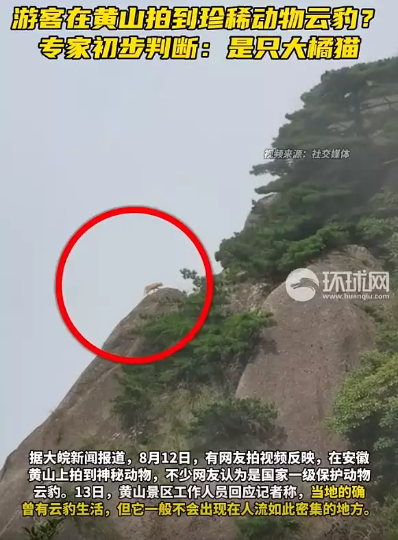 动物专家高燕鸿看到视频之后,也是说应该不是属于云豹,这动物不害怕人,因此有可能是人类圈养的,他推测,这有可能是从周边动物园或养殖基地逃出来的动物,建议游客与它保持距离除了这一位动物专家之外,安徽大学动物专家虞磊也公开指出,他近几年在黄山风景区开展地面监测时,多次在山顶看到过多只橘猫,“因游客投喂较多,这些橘猫的体型较大。