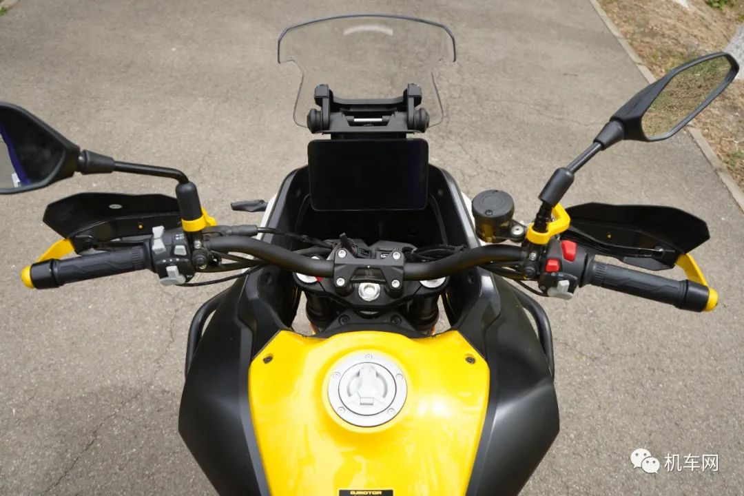 而且两边还有点垫着大腿内侧的感觉,把腿收上来踩上脚踏,垫着的感觉就少了,因为他坐高比较低,所以腿部还是有一些收着的感觉;车把比较宽且有一个向后的角度,上身还是比较舒展的,能够给人ADV探险车的感觉。