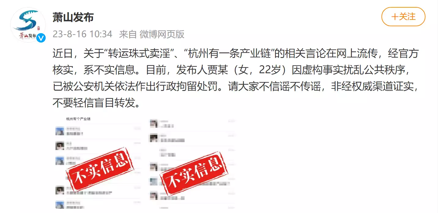 8月16日,据萧山发布消息:近日,关于“转运珠式卖淫”、“杭州有一条产业链”的相关言论在网上流传,经官方核实,系不实信息目前,发布人贾某(女,22岁)因虚构事实扰乱公共秩序,已被公安机关依法作出行政拘留处罚。