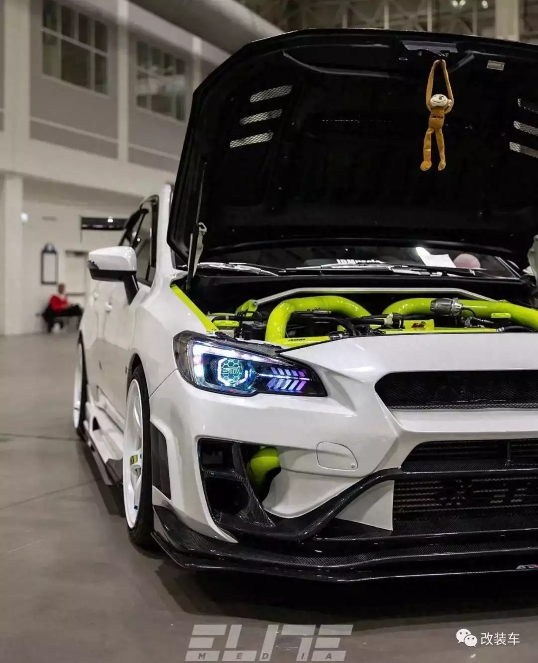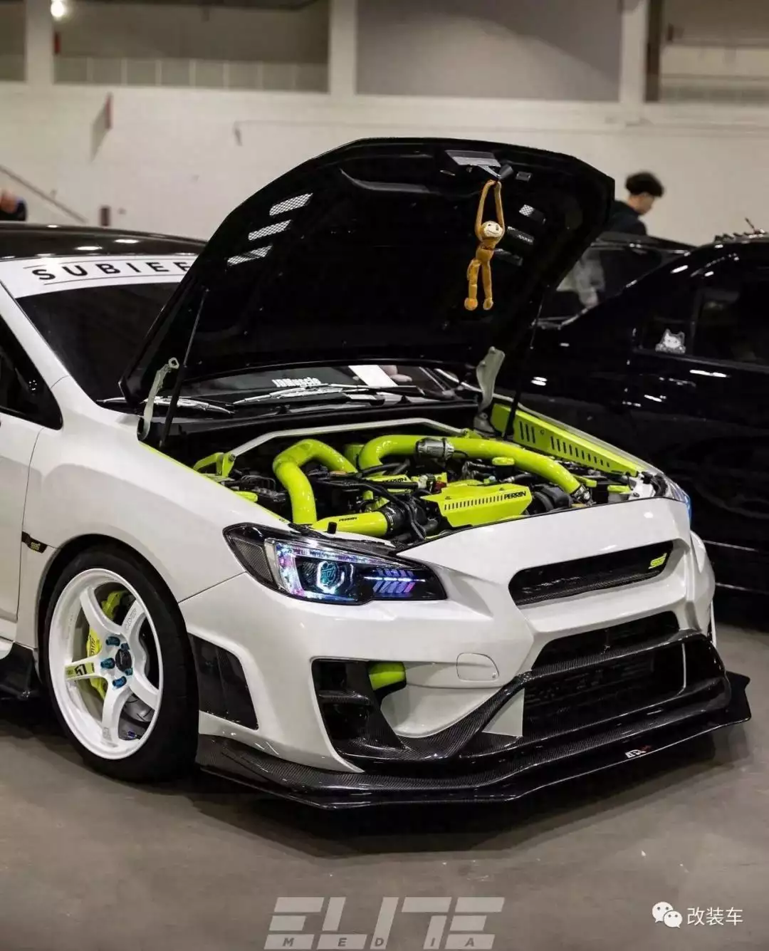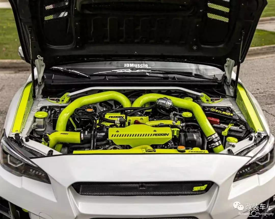 "打开机舱盖后,还能看到COBB碳纤维保险丝盒盖、Perrin&Billetworkz引擎仓装饰,以及各种荧光绿色的管道,让人看起来就觉得这辆车并不那么简单。"