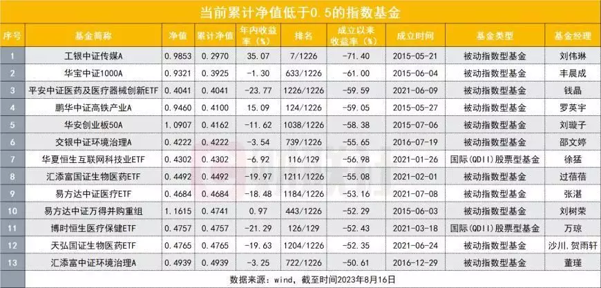 指数基金发行节点决定未来收益长期来看,发行在人声鼎沸之时,往往要承受回撤风险这一点,指数基金投资者体会的更为深刻截至8月16日,全市场有13只指数基金累计净值低于0.5,也意味着这些指数基金亏损超过50%。