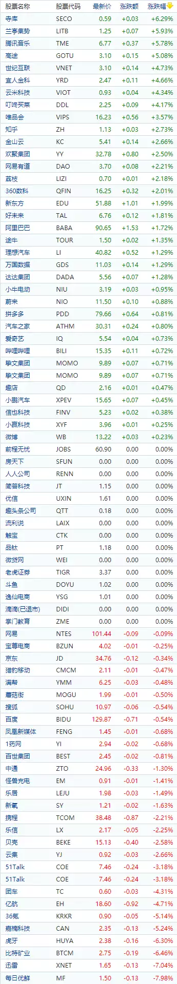 联代科技,唯品会,达内科技,海天网络,泛生子基因等涨超3%,宁圣国际,网易有道,知乎,诺亚财富,陆金所控股,易电行,金山云,名创优品,华迪国际,大健云仓,欢聚集团等涨超2%,阿里巴巴、理想汽车涨超1%,蔚来、拼多多、爱奇艺、哔哩哔哩、小鹏汽车、微博小幅上涨