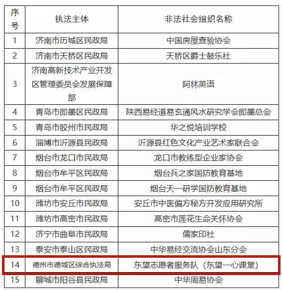 为进一步加大对非法社会组织的打击整治力度,充分发挥社会监督作用,山东省民政厅近日向社会集中公布一批我省民政部门依法取缔、劝散的非法社会组织名单,请社会公众提高警惕,避免上当受骗社会公众如果发现名单中的非法社会组织仍在开展活动的,可依法向公安机关报案。