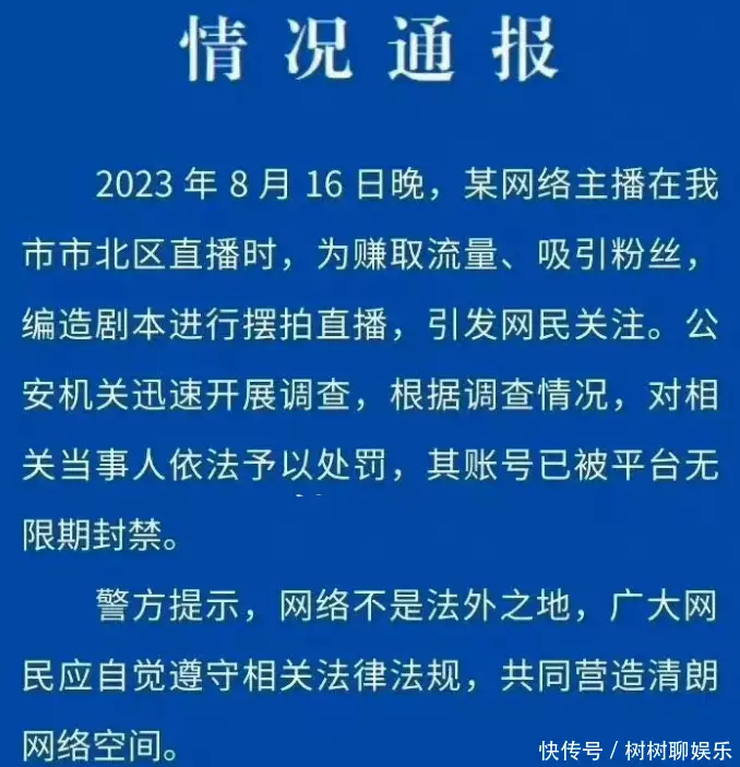 当地部门发出通报,网络主播在视频直播时编造剧本引发网民关注,对当事人依法处罚账号被无限期封禁二驴炒作摆拍,故意让别人打他,让一些网友心疼他,但打架斗殴都是违法的,网络不是法外之地,我们应该自觉遵守法律,营造清朗的网络空间。