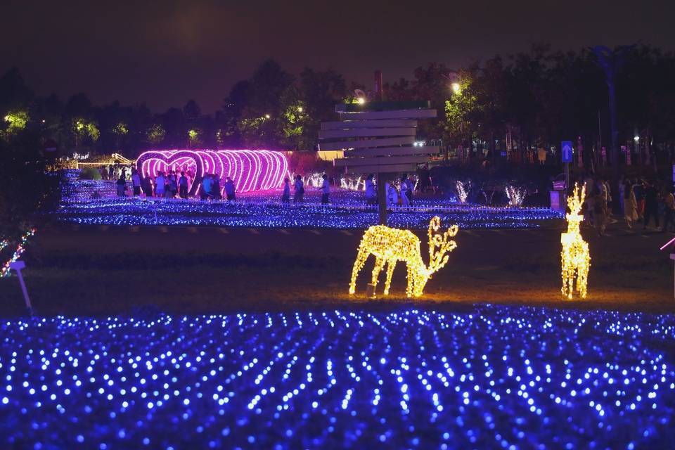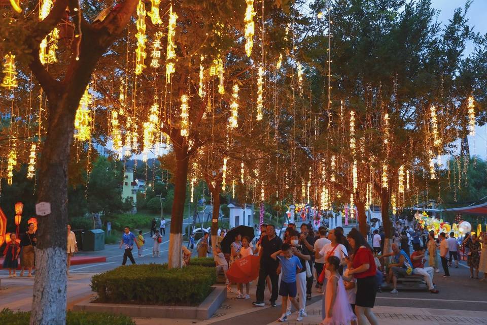 7月29日晚,在位于青岛市李沧区的青岛世博园景区内,灯光璀璨、热闹非凡,市民和游客品美食、赏花灯、逛市集、观赏水舞秀表演。