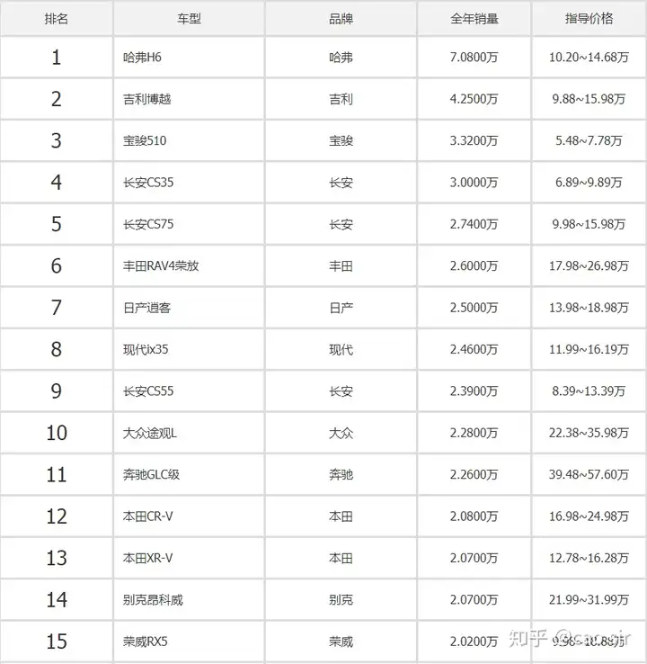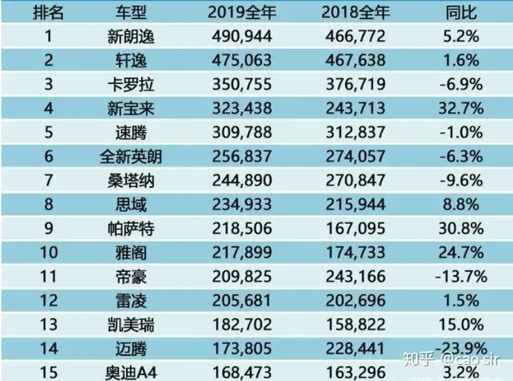 先上两个图:分别是2019年全年轿车销量排行榜和2019年全年SUV销量排行榜。