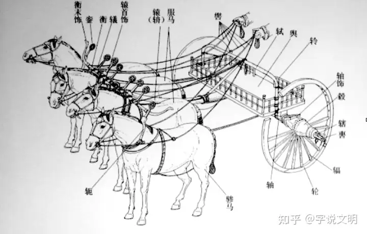 3)关于车辕(辀)的部分,这是前面牵引车辆的主要受力部件辀/辕,单根为辀,用于小车的中间,呈曲形;双根为辕,用于大车的左右,为直杠辕(辀)前端的横木叫车衡,居辕(辀)之下,与轭相连接辕(辀)的后端固定于轸。