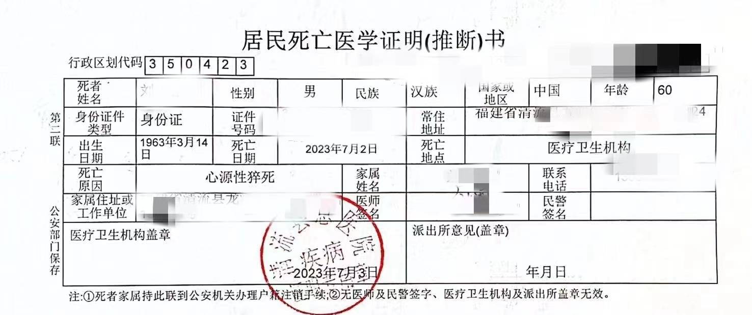 死亡医学证明书图/受访者提供她说,公公病发时,打电话让住在附近的一个兄弟过来送其去医院“叔叔到达后,却发现我公公瘫坐楼梯上,浑身冒冷汗,已经说不出话了”她称,一名职业为医生的邻居说,以公公现在的情况不能随意挪动,于是他们打了120。